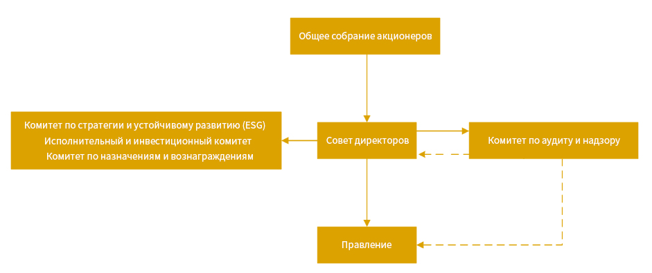 Совет директоров имеет четыре специализированных комитета: комитет по стратегии и устойчивому развитию (ESG), исполнительный и инвестиционный комитет, комитет по аудиту и надзору и комитет по назначениям и вознаграждениям. Они выполняют четко определенные обязанности и работают эффективно, используя профессиональный опыт для поддержки работы совета директоров, соблюдения норм и процедур и принятия осмотрительных решений.